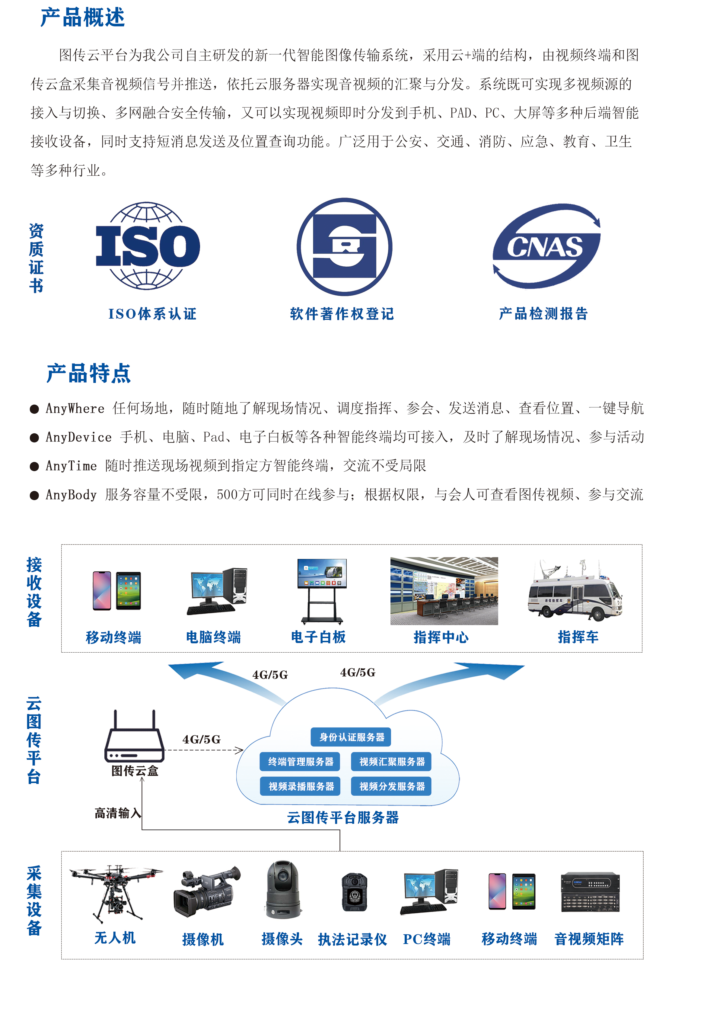 圖傳云平臺是一款云圖傳產品,采用云+端的結構,依托云服務器實現音視頻的匯聚與分發,最終實現音視頻的遠距離傳輸。圖傳云平臺包括圖傳終端、平臺云服務器以及客戶端程序。