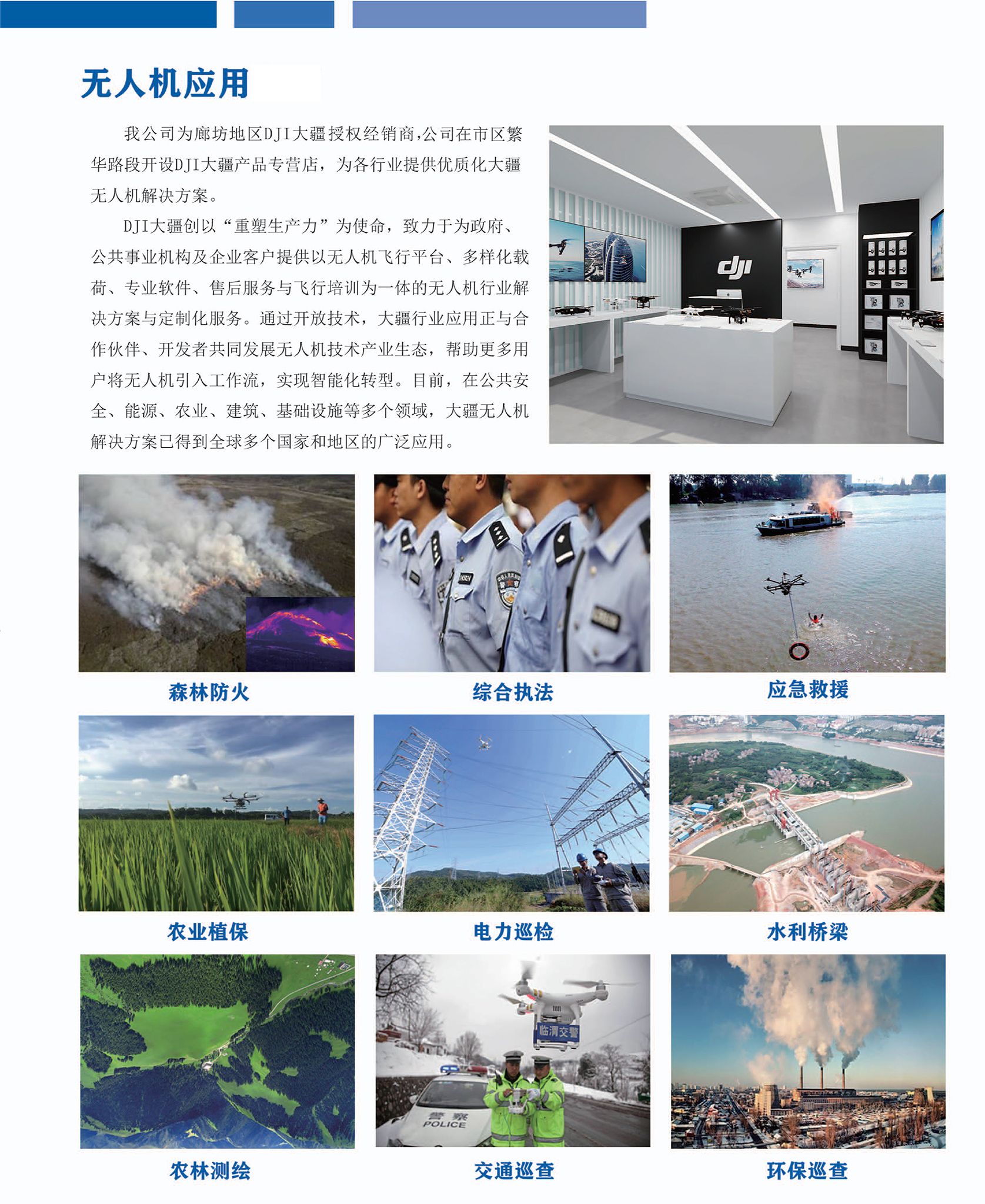 我公司以“重塑生產力”為使命,致力于為政府、公共事業機構及企業客戶提供以無人機飛行平臺、多樣化載荷、專業軟件、售后服務與飛行培訓為一體的無人機行業解決方案與定制化服務。目前,在公共安全、能源、農業、建筑、基礎設施等多個領域,解決方案已得到多個地區與行業的廣泛應用。