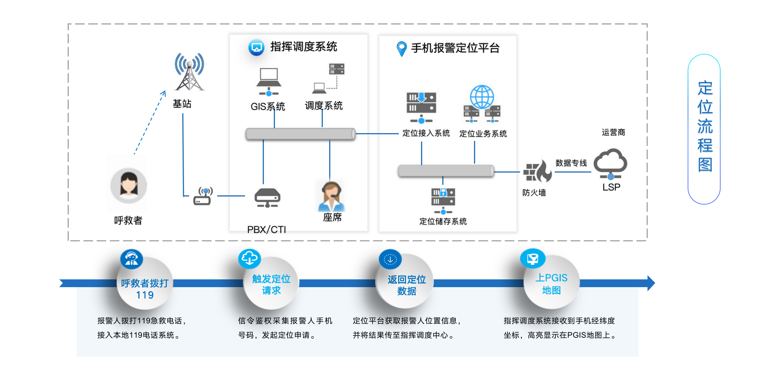 以運營商基站和通信核心網為依托,一方面與各類接處警系統接入服務連接并實現通信,另一方面與三大運營商的定位接入網關統一對接,實現與運營商定位服務器間的通信和定位功能。